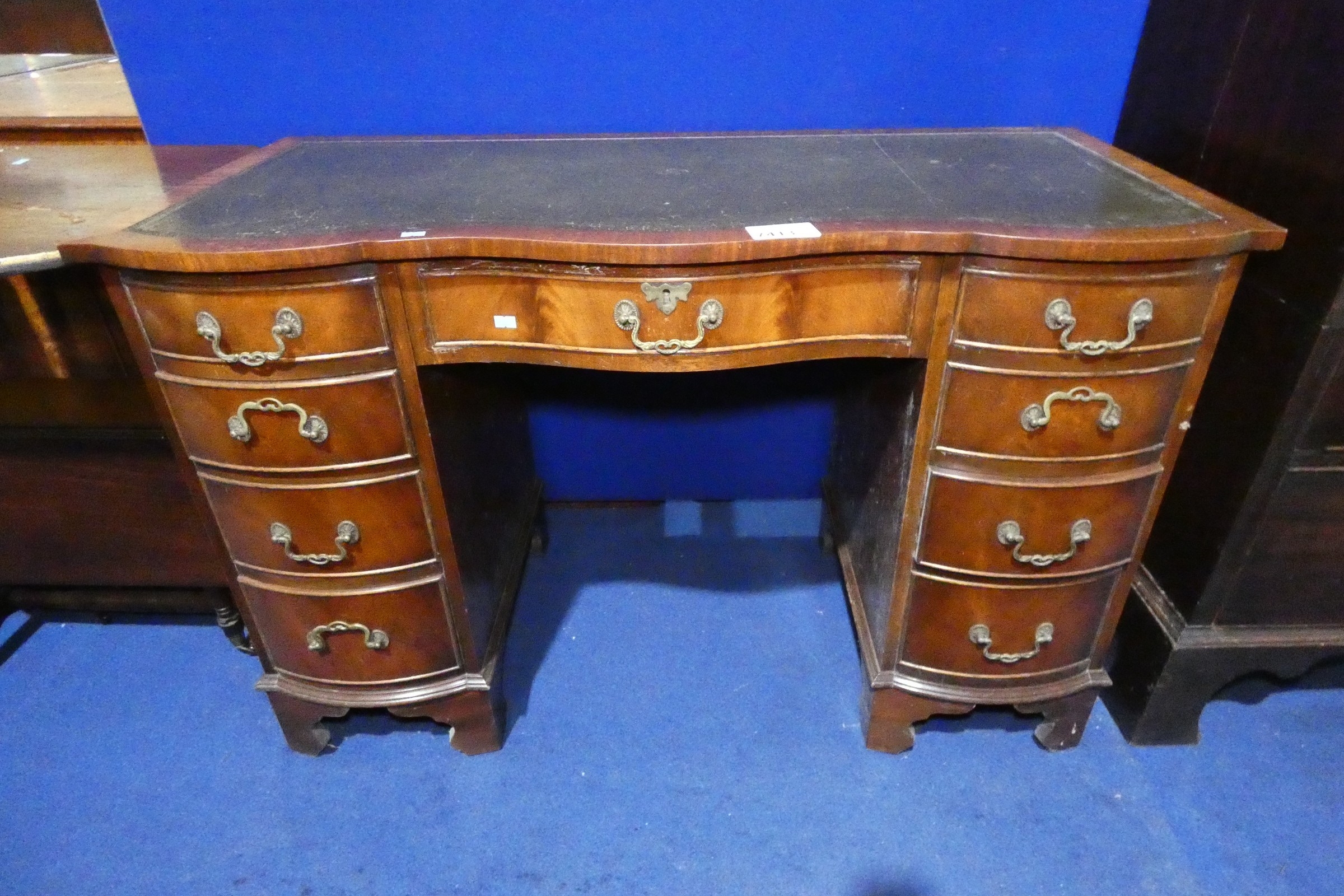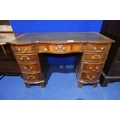 A reproduction walnut shaped front pedestal writing desk with a tooled leather top, one central and eight side drawers, approximately 115 cm wide
