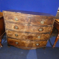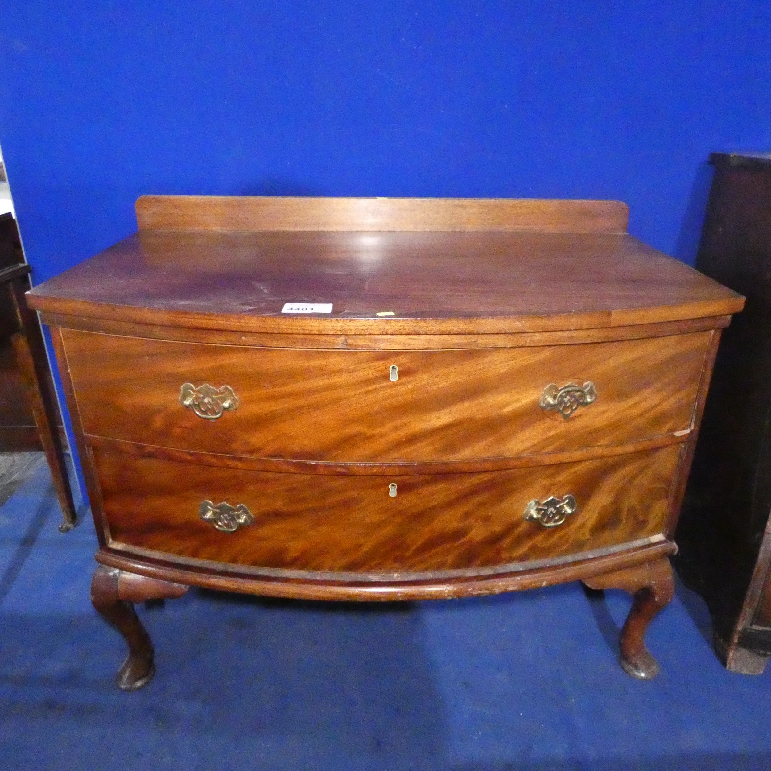 A vintage mahogany bow front chest of two drawers on cabriole legs, approximately 103 centimeters wide