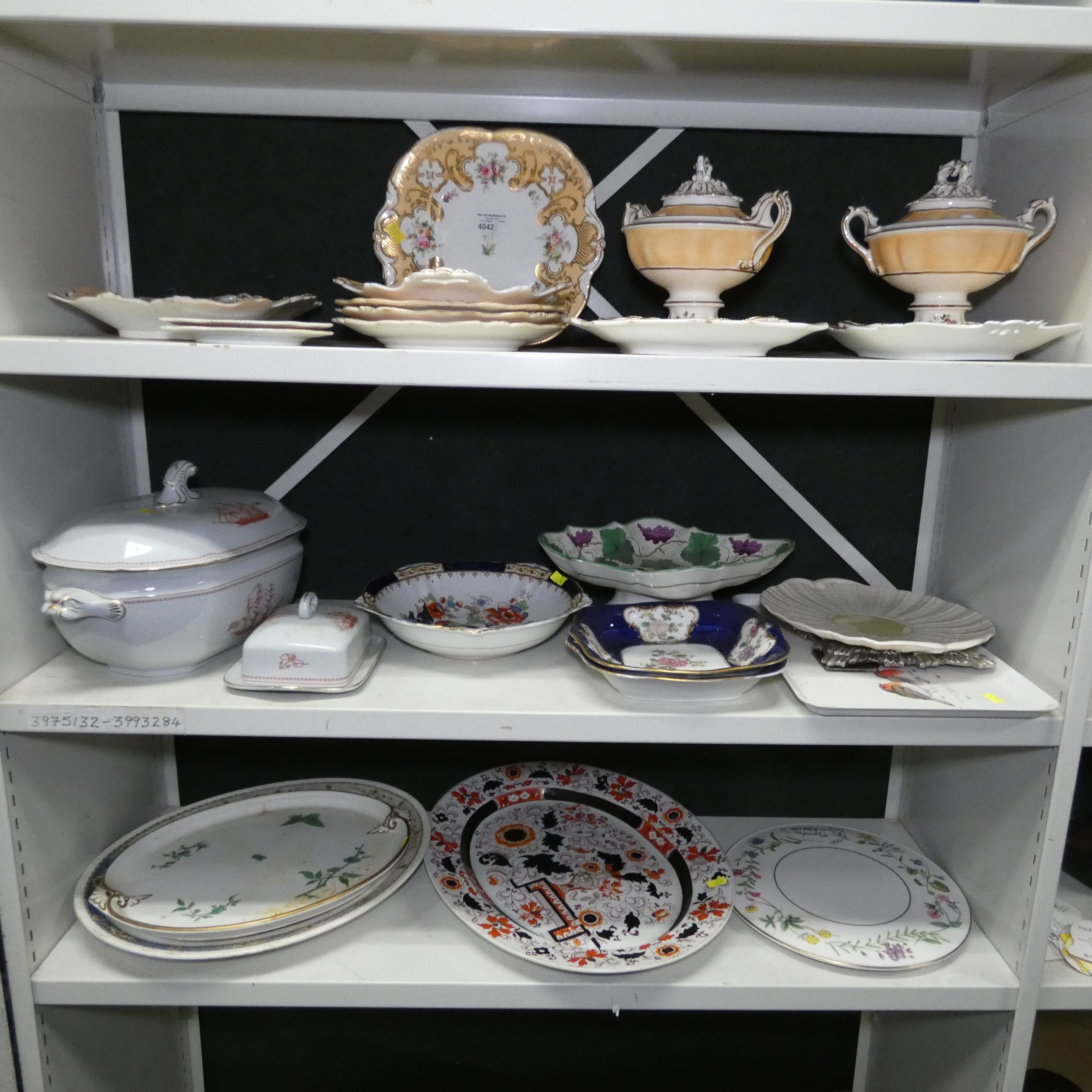 A quantity of decorative dinnerware, large plates and platters and other chinaware (three shelves)