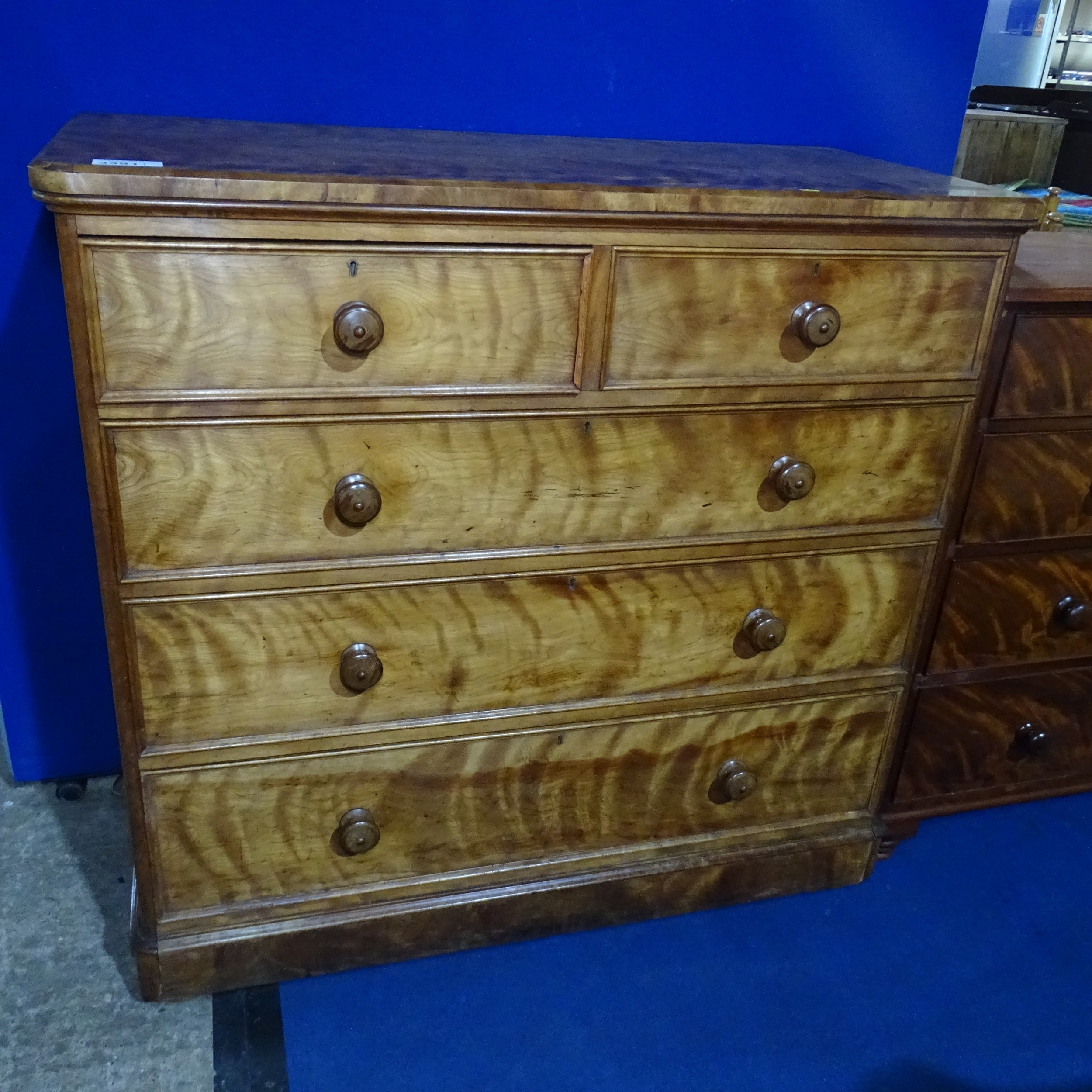 A 19th century vintage golden birch bedroom chest of two short and three long drawers with turned knobs, approximately 115 cm wide