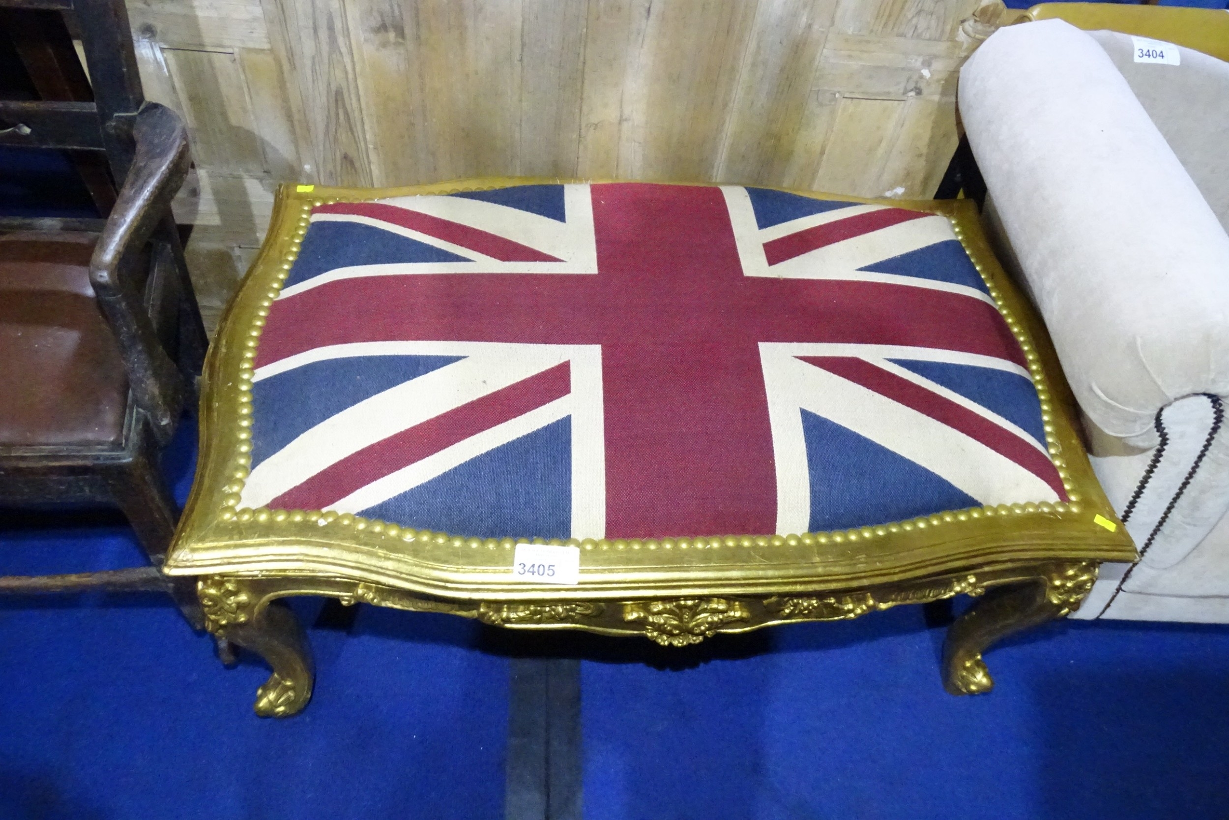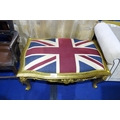 A very ornate gilt work stool with an upholstered Union Jack...