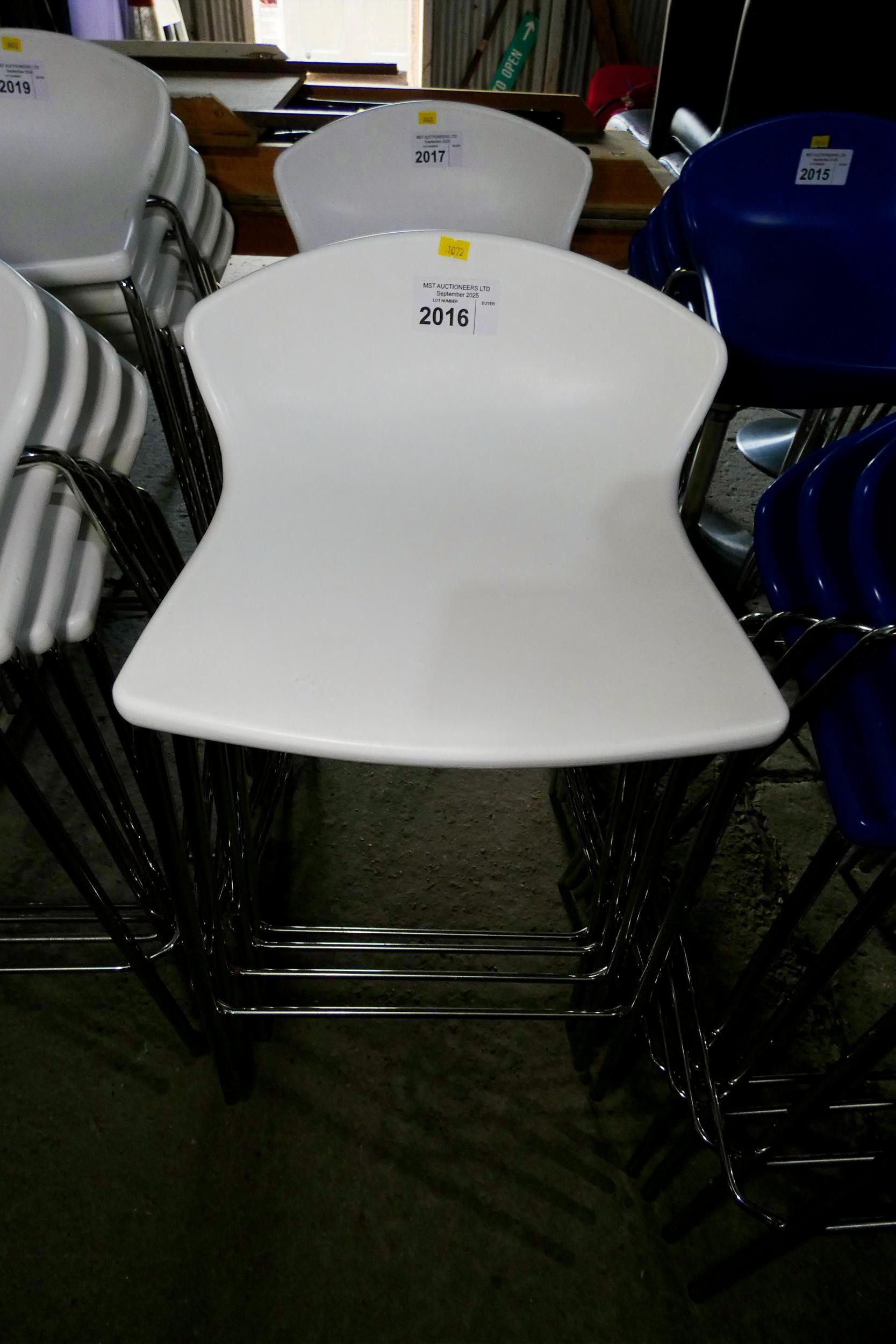A set of 4 tall white plastic metal framed stacking stools