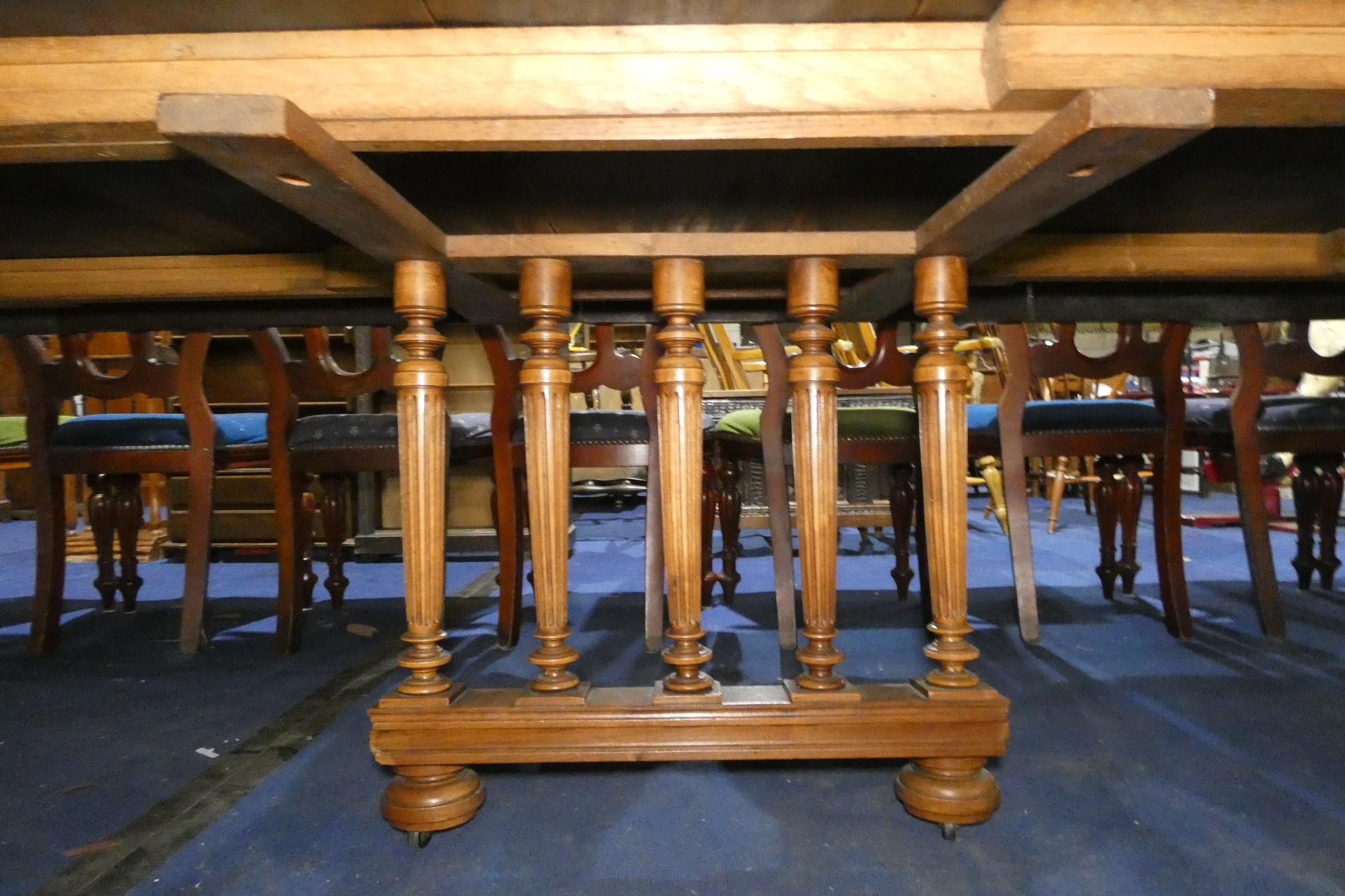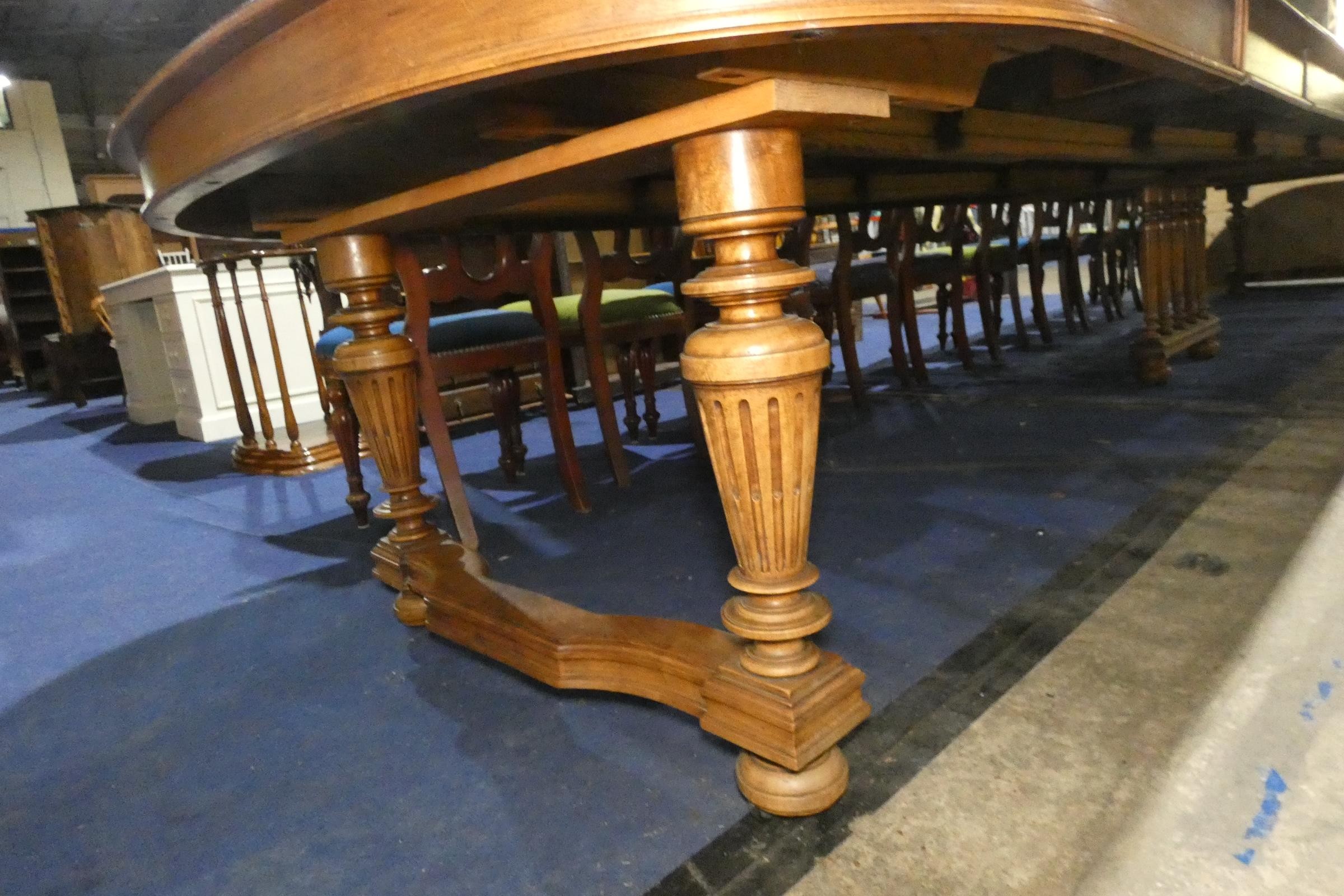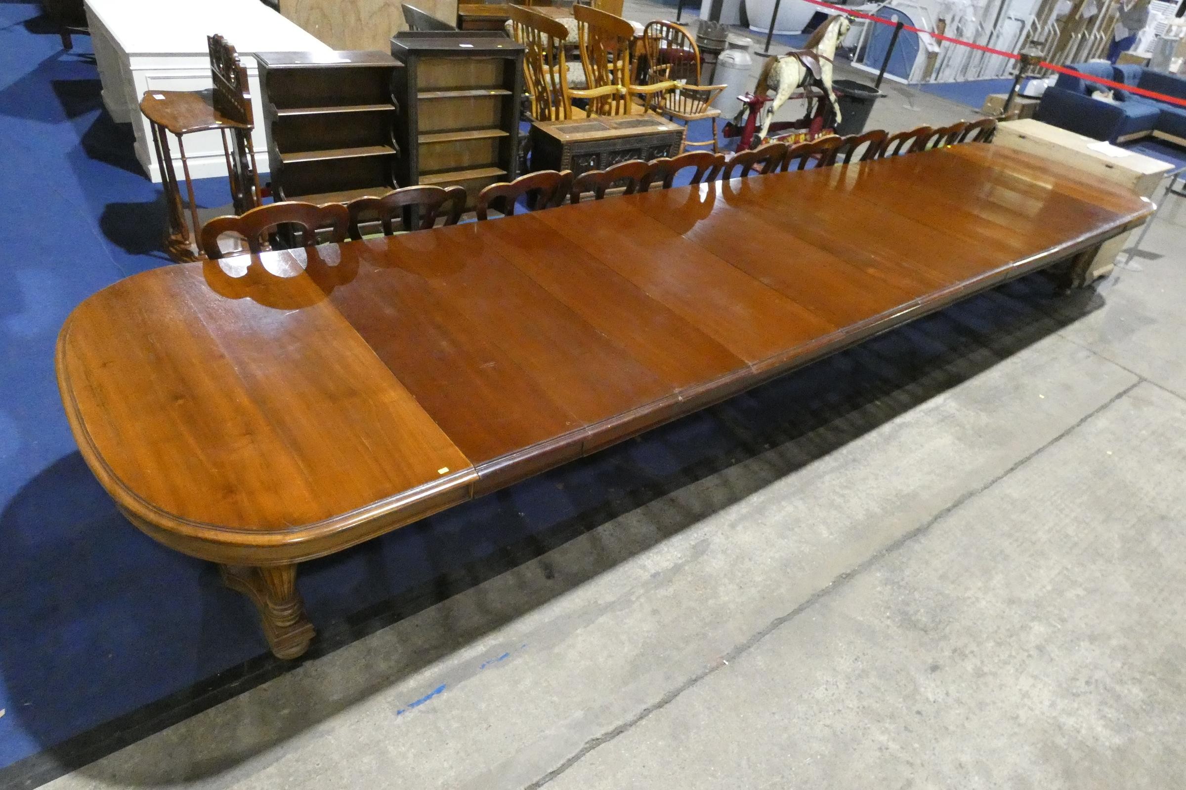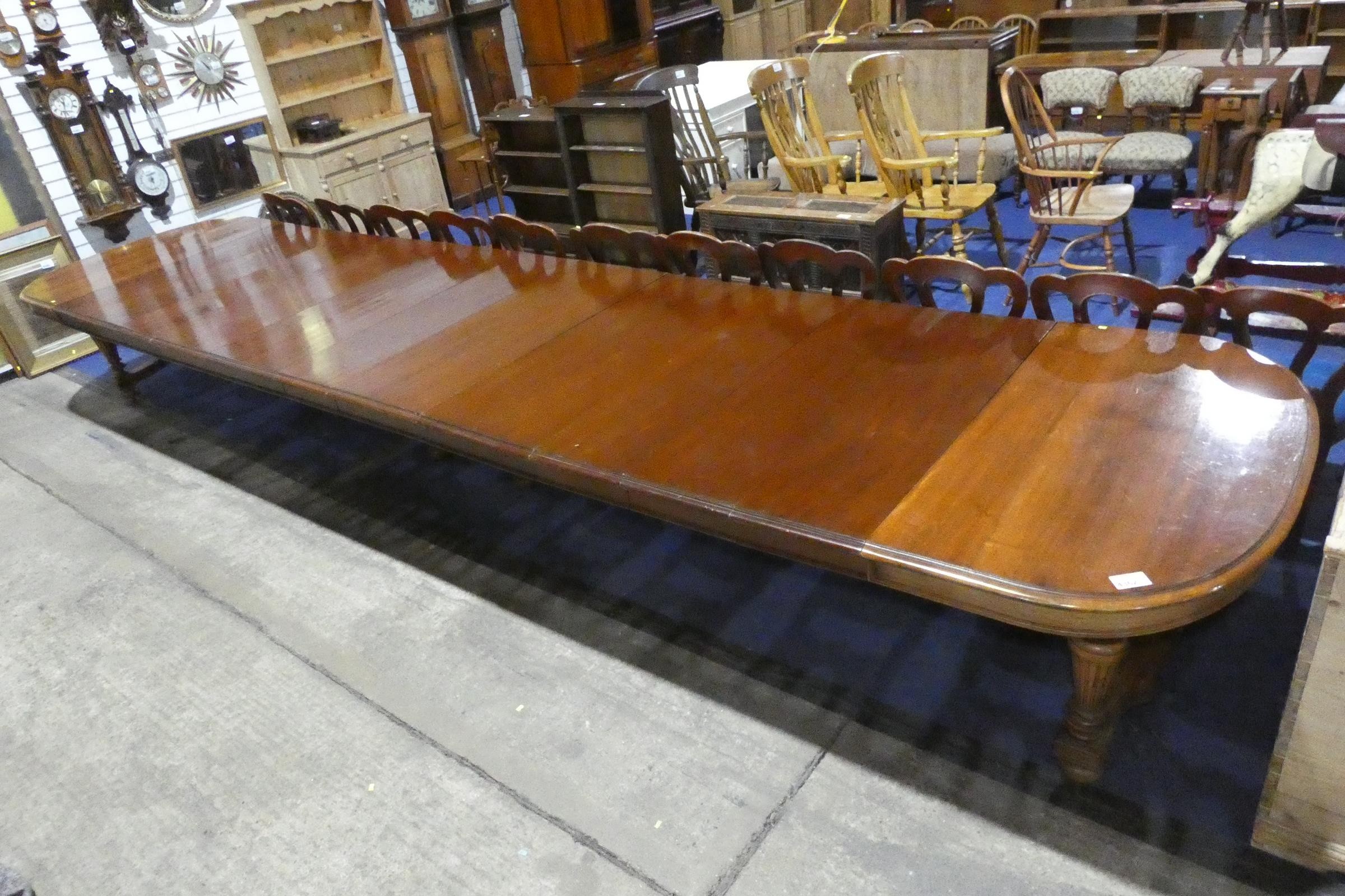 A large Edwardian mahogany pull-out extending dining table with "D" ends and 11 extra leaves, on fluted and tapered legs, extending to approximately 570cms (18.7ft)