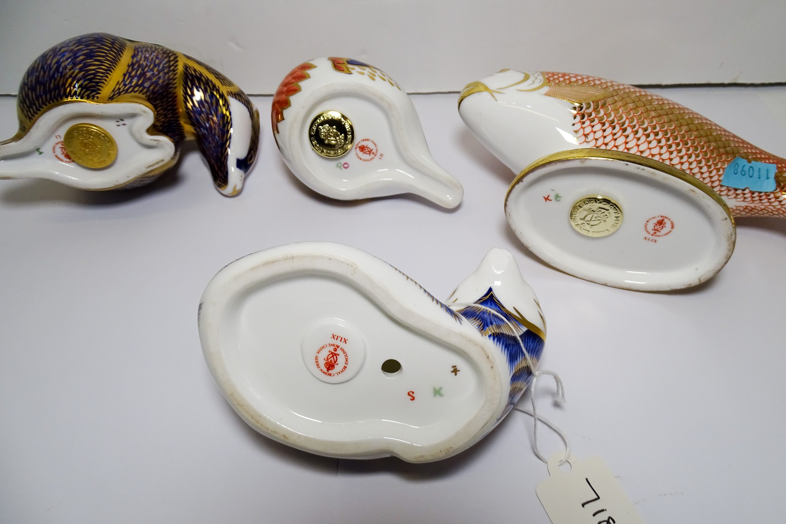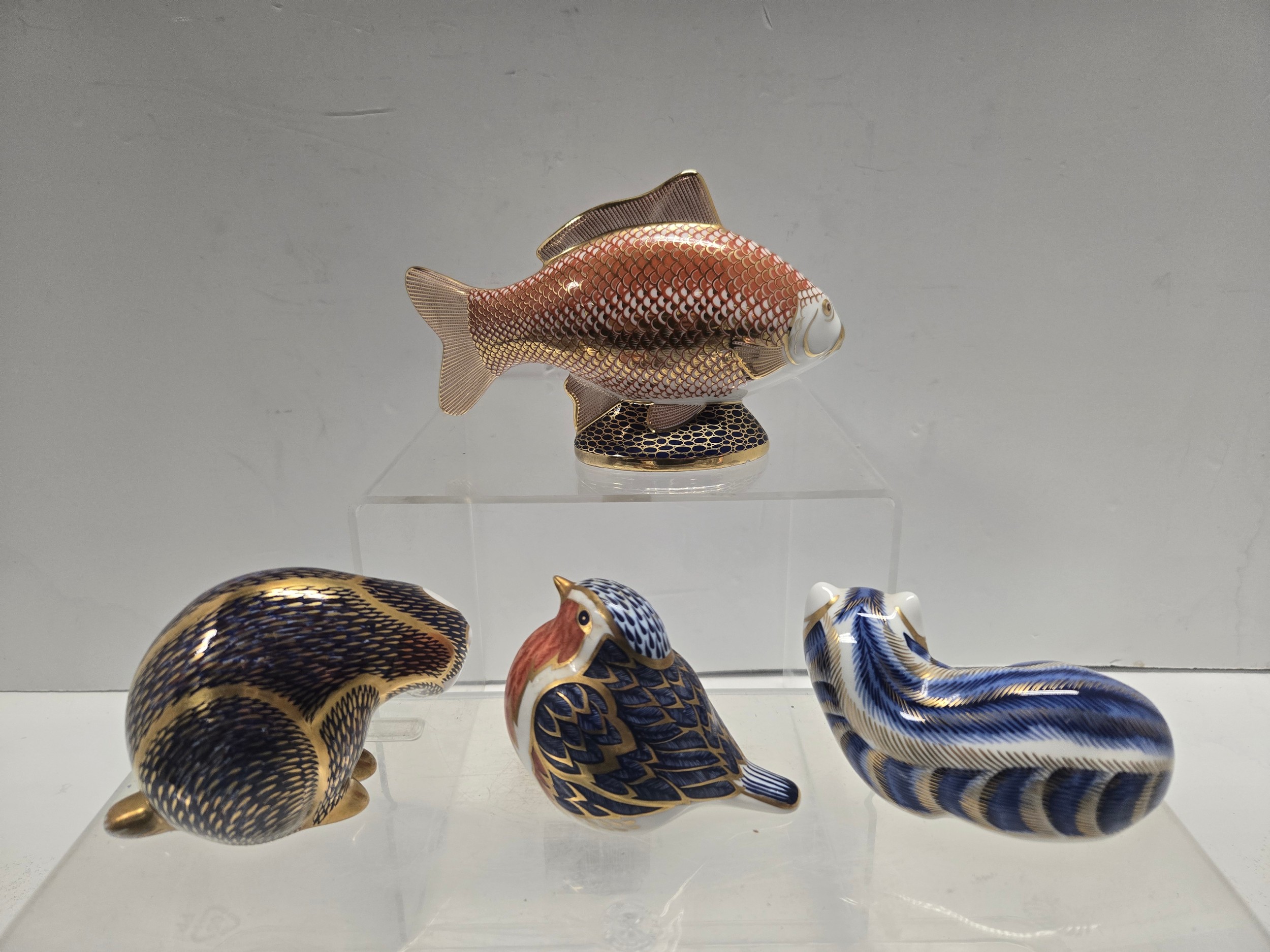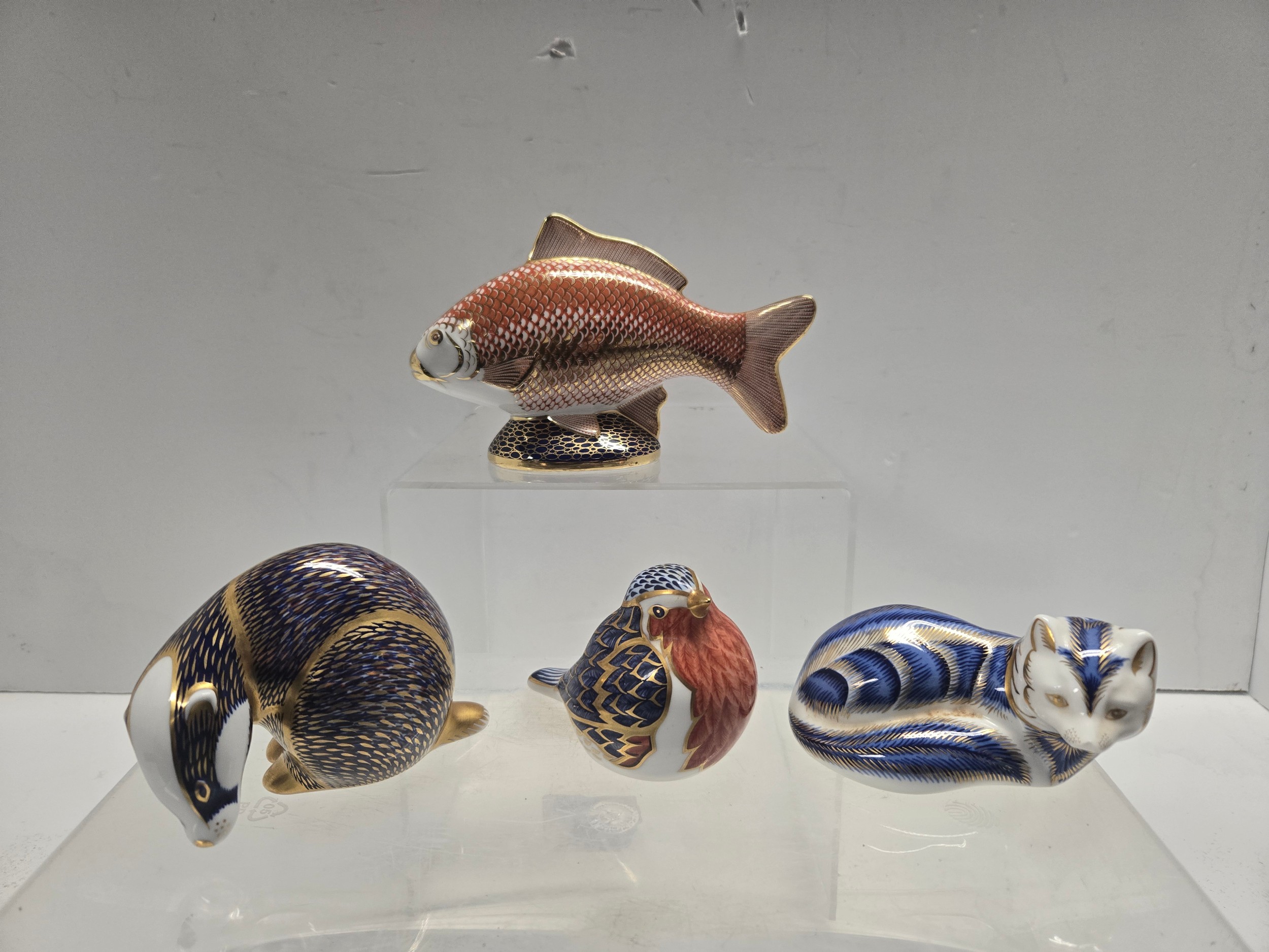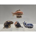 4 x Highly decorative Royal Crown Derby paperweight/animal figures to include 1 x Badger, 1 x Robin, 1 x Arctic Fox and 1 x Koi