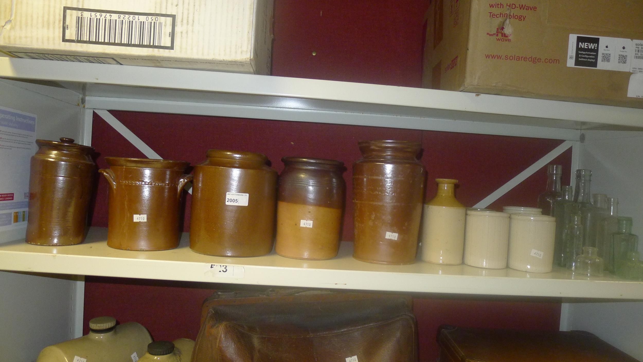 A quantity of miscellaneous vintage stoneware jars and hot water bottles, a quantity of old glass bottles, a leather doctor's bag and a small vintage suitcase (two shelves)