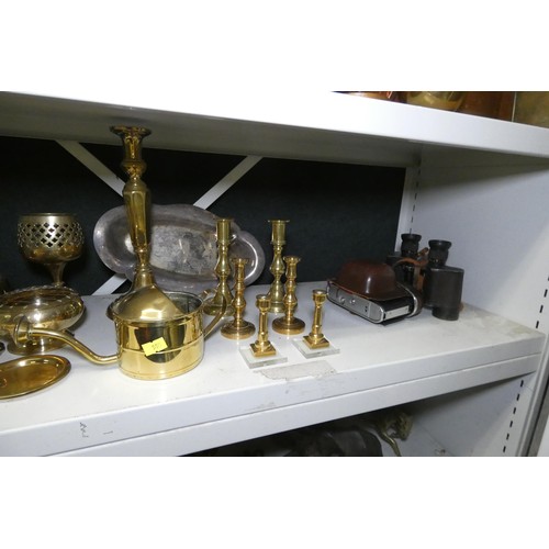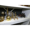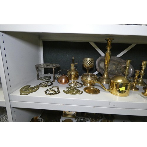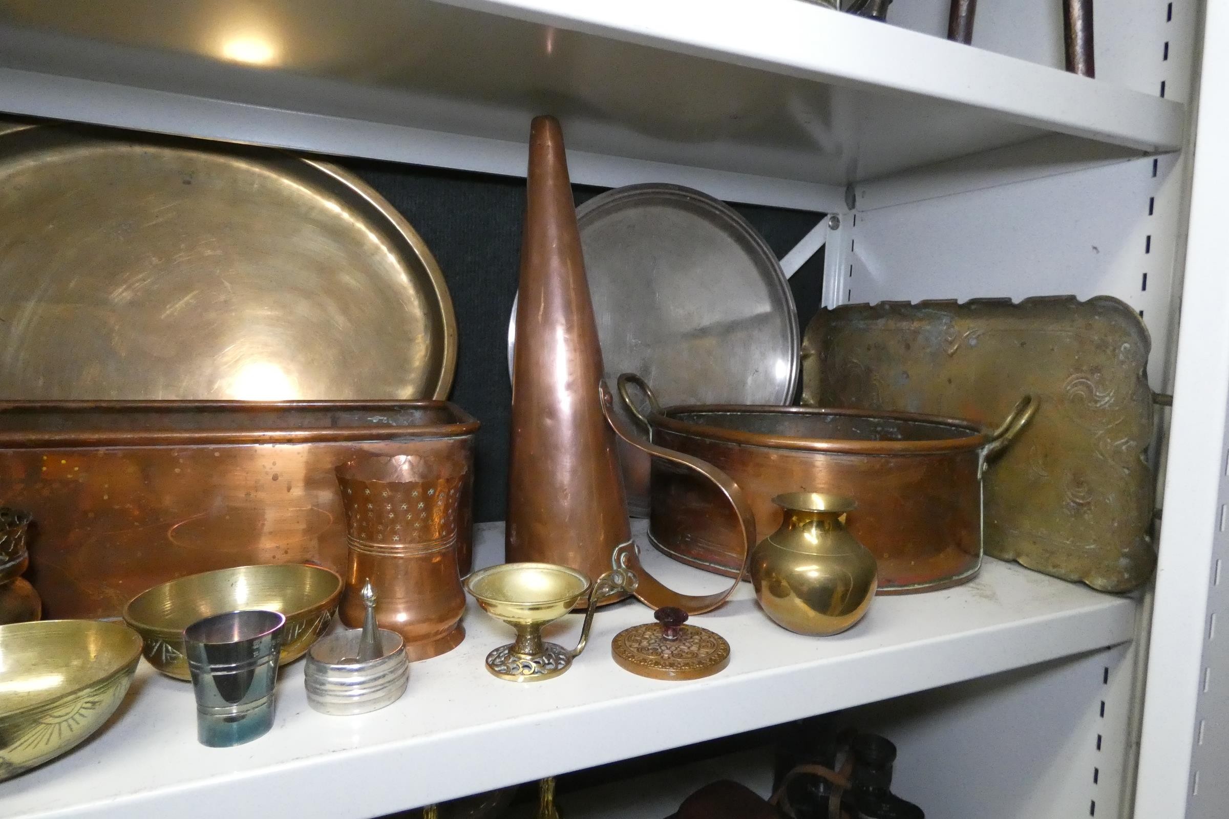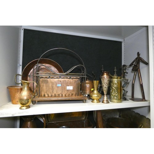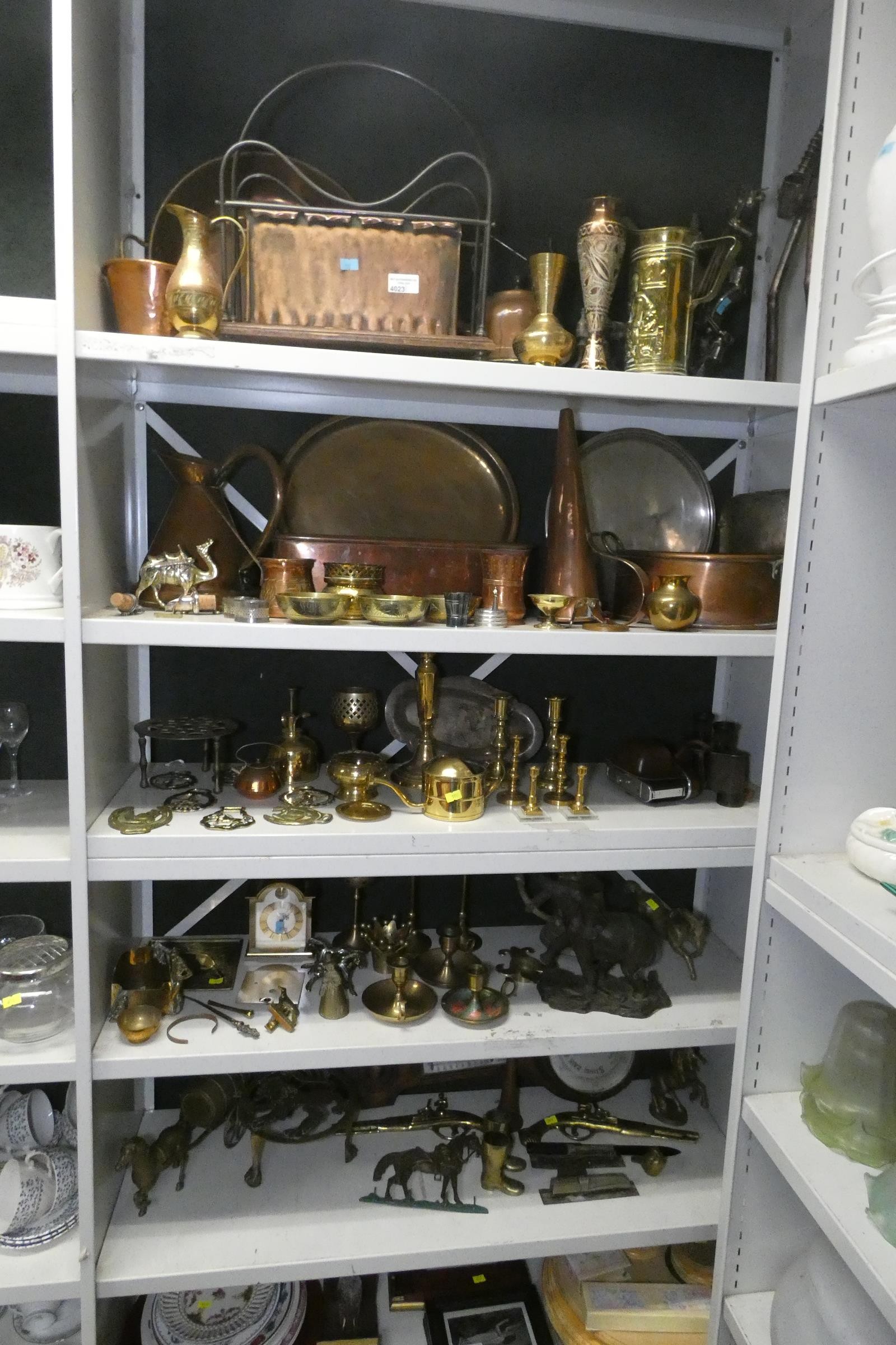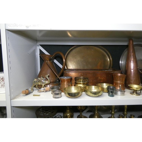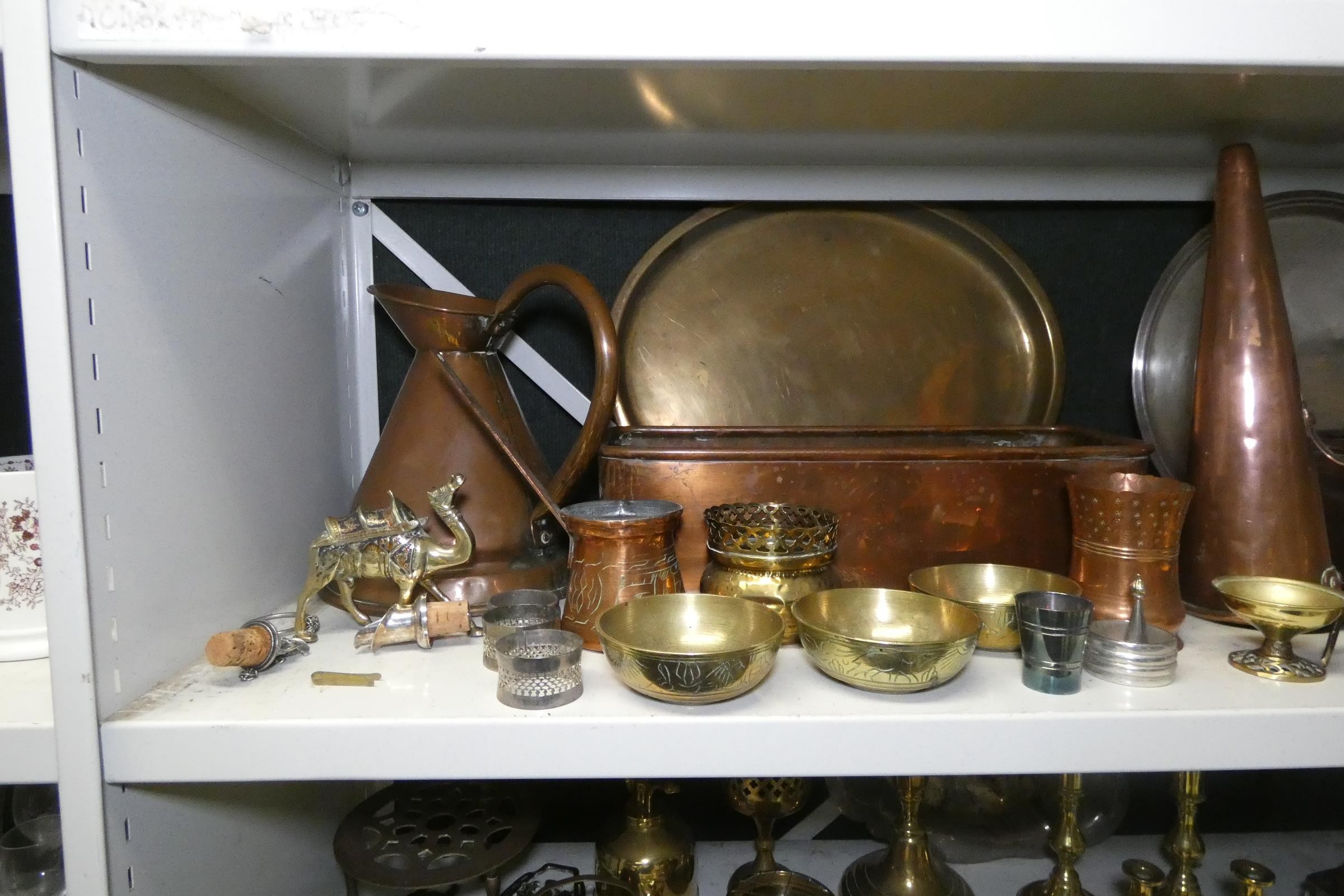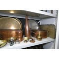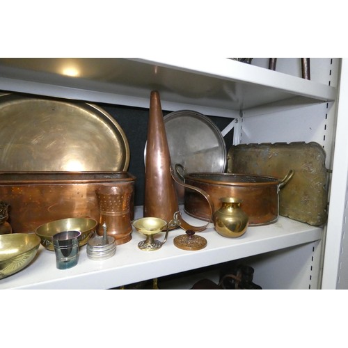 A large quantity of miscellaneous decorative copper and brassware including; conical jugs, preserving pans, candlesticks and other ornaments etc (five shelves)