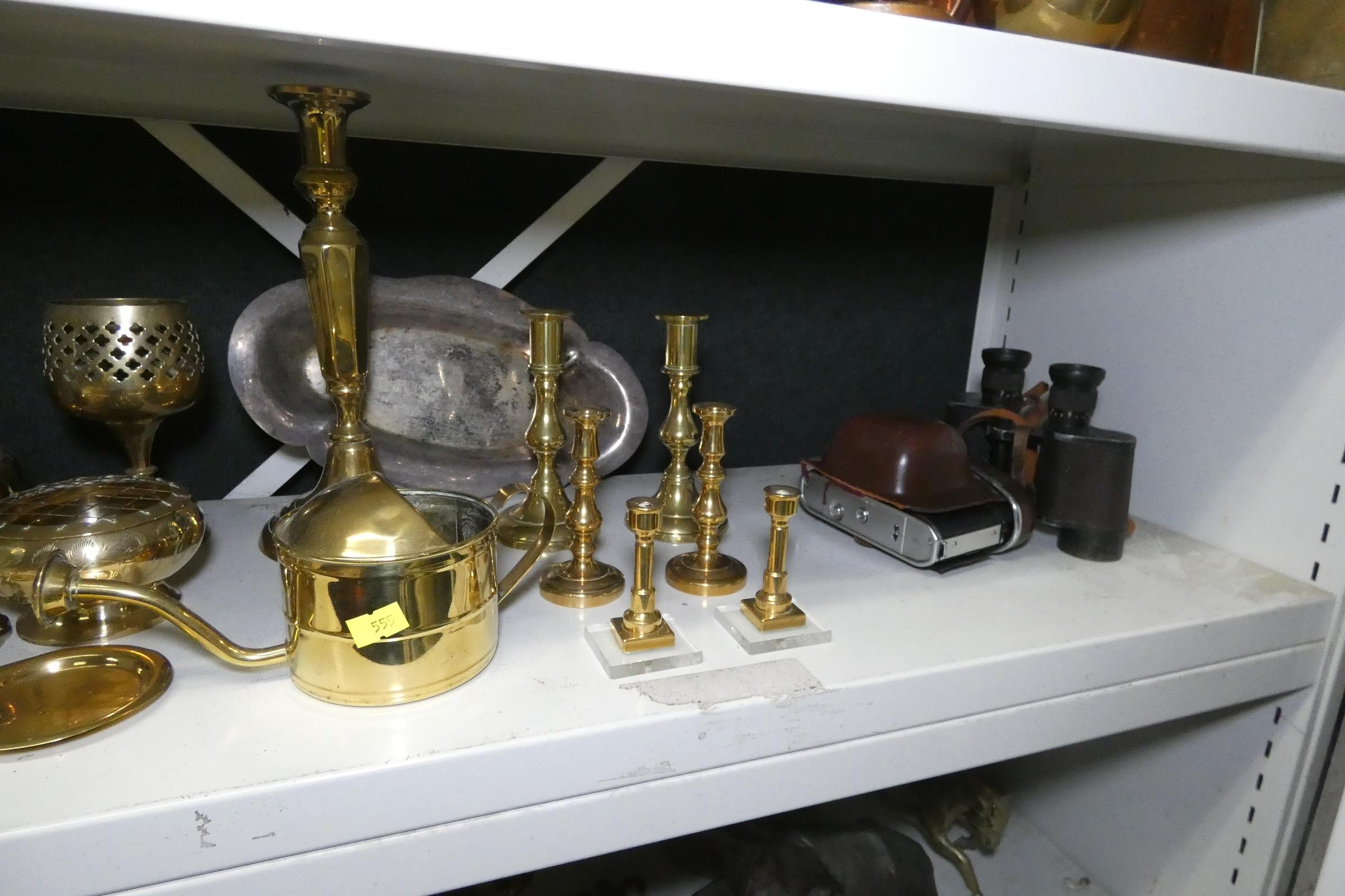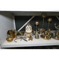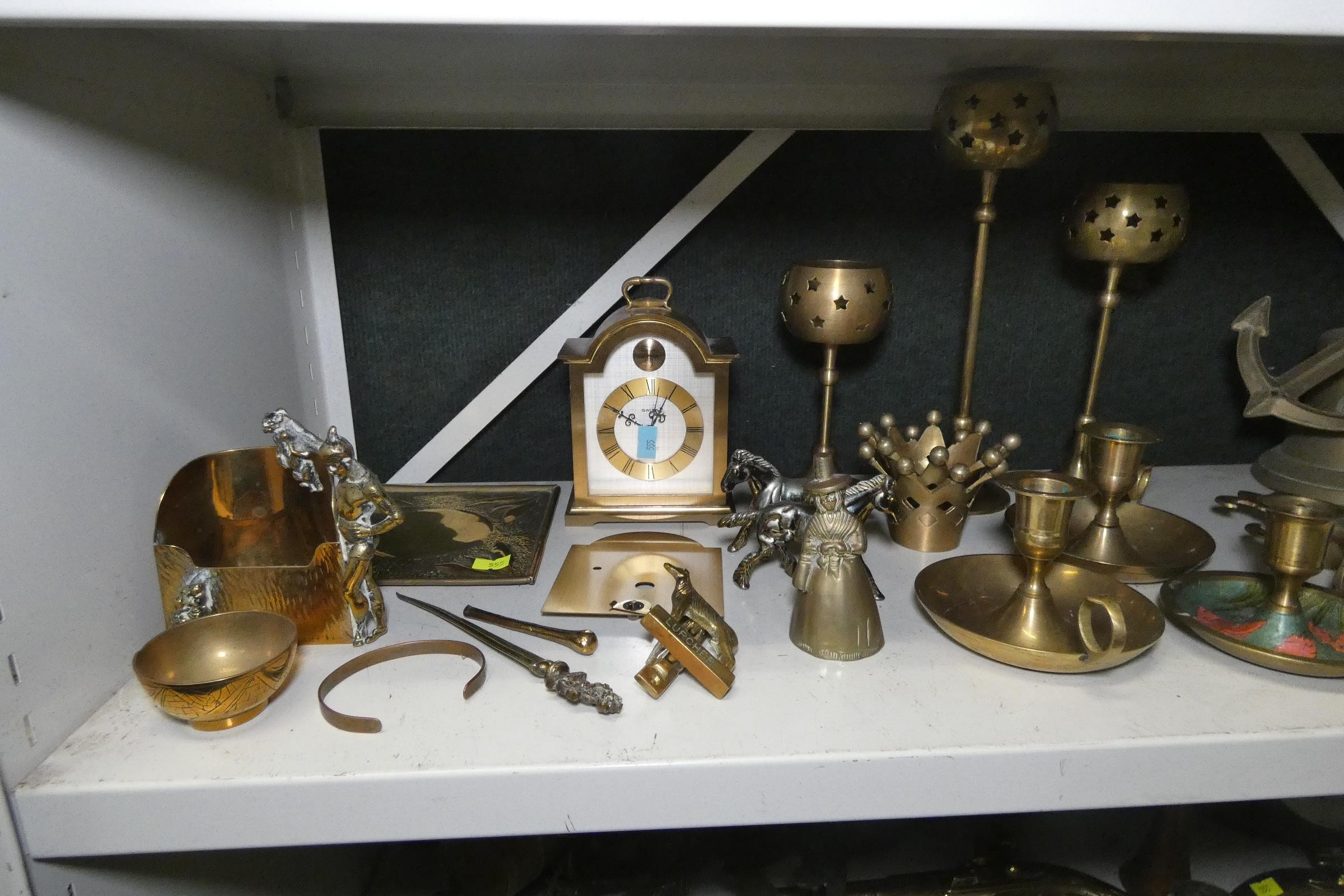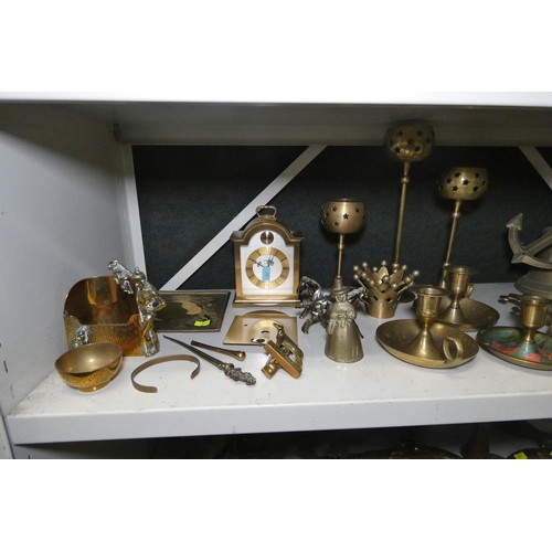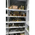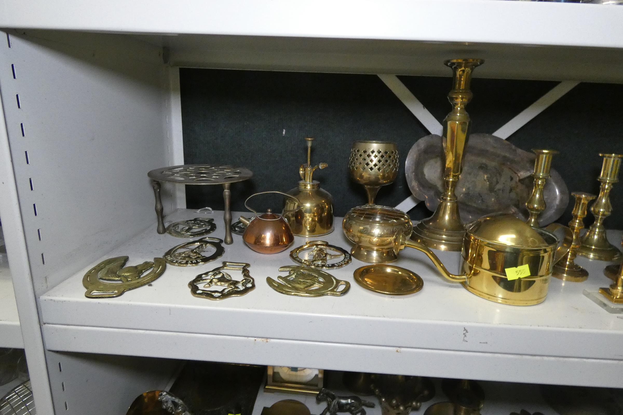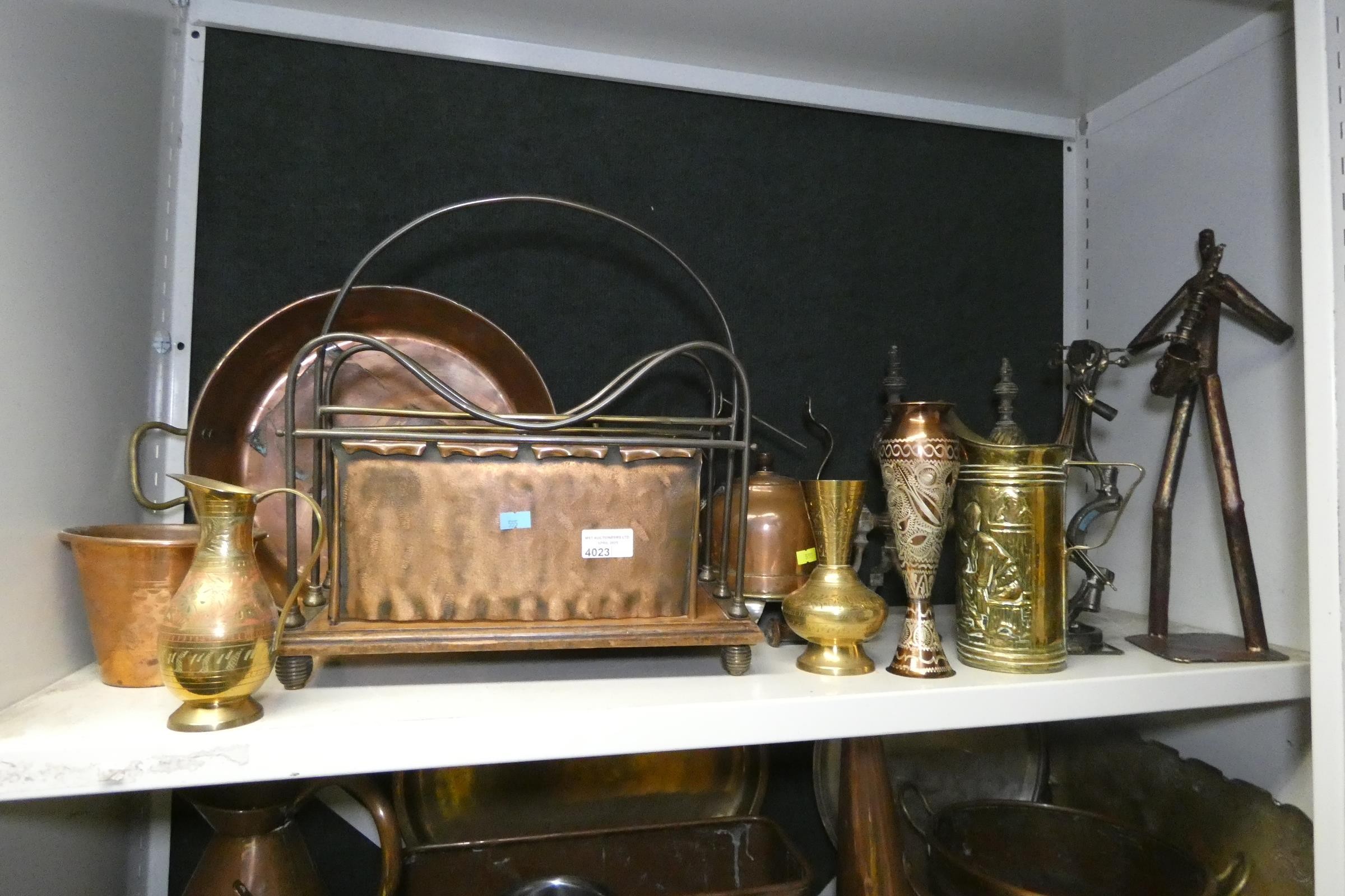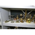 A large quantity of miscellaneous decorative copper and brassware including; conical jugs, preserving pans, candlesticks and other ornaments etc (five shelves)