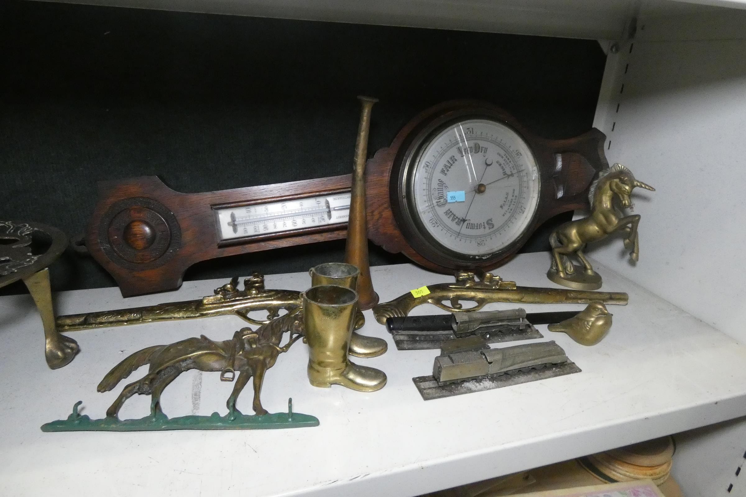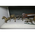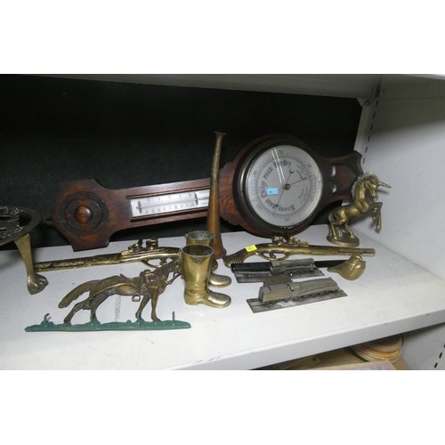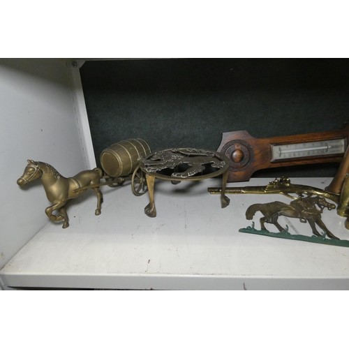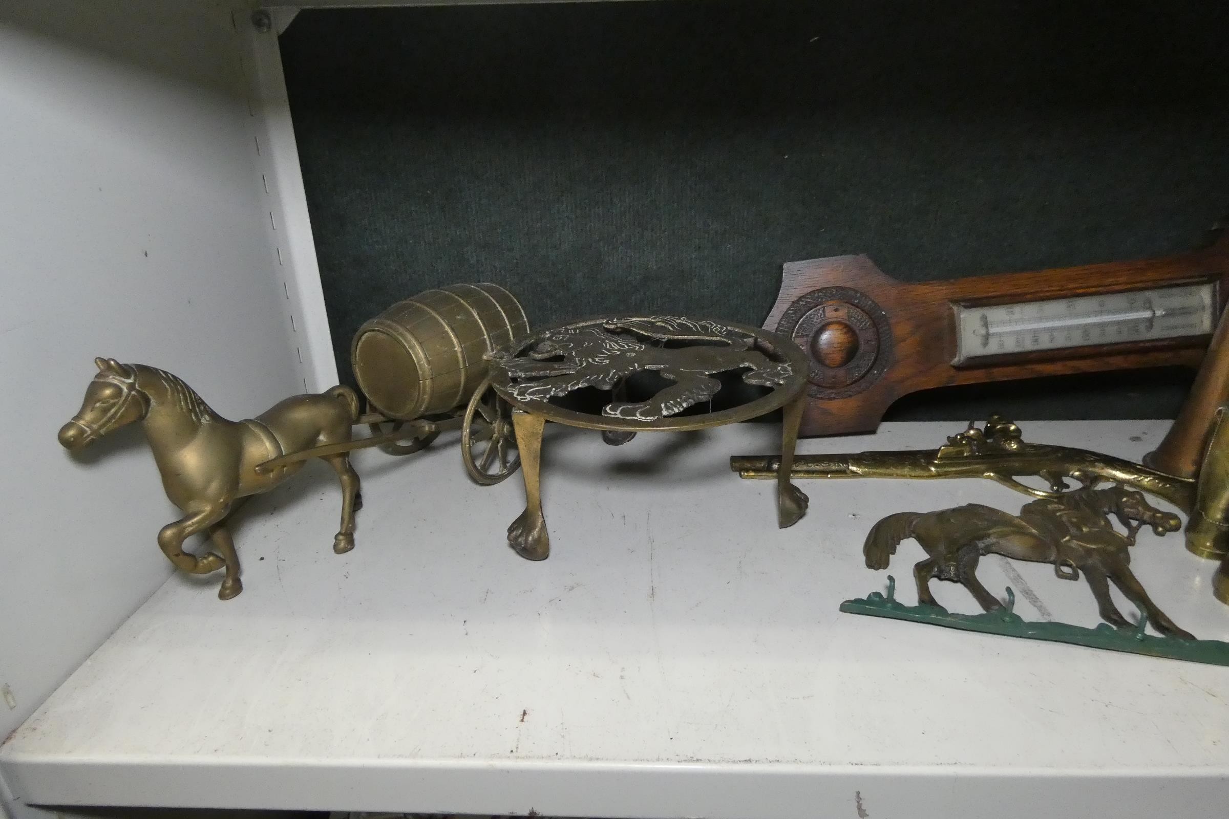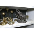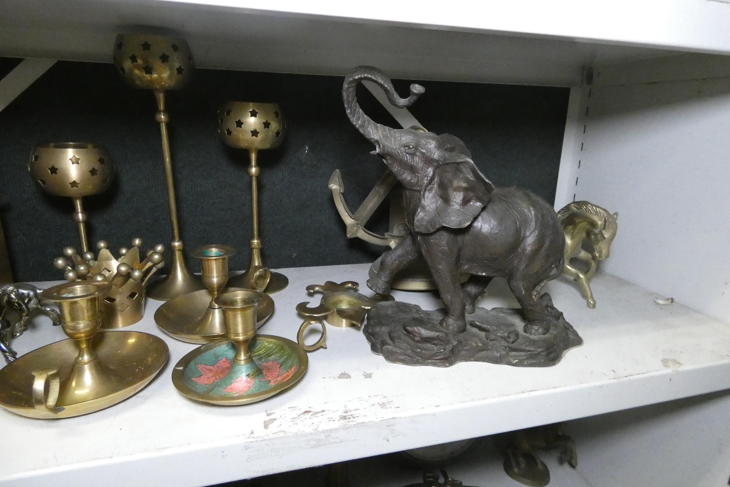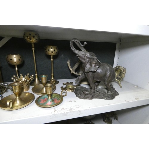 A large quantity of miscellaneous decorative copper and brassware including; conical jugs, preserving pans, candlesticks and other ornaments etc (five shelves)