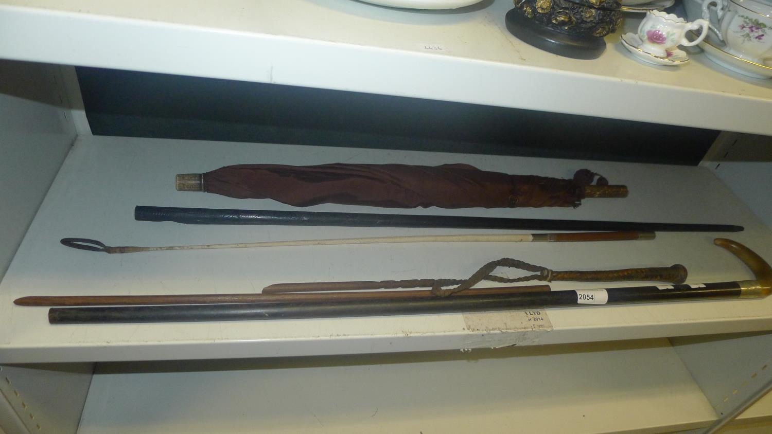 A small collection of miscellaneous vintage walking sticks, umbrella and riding crops etc