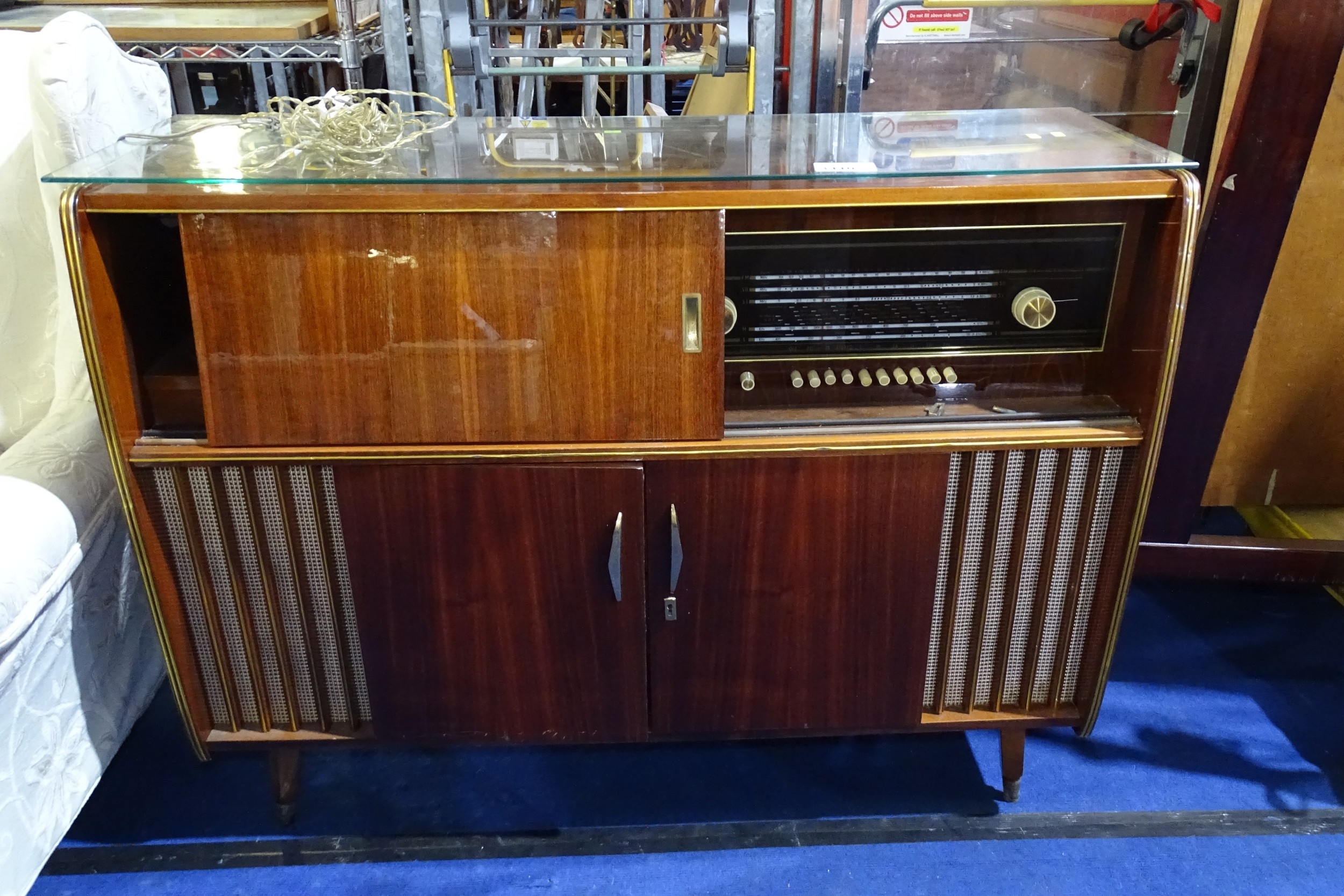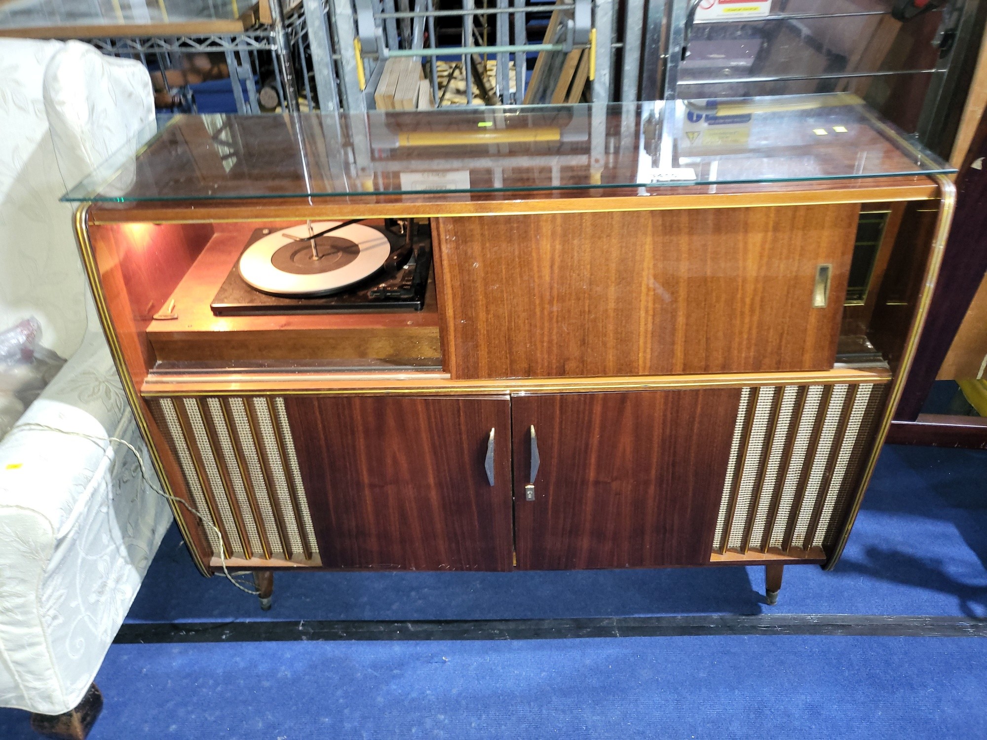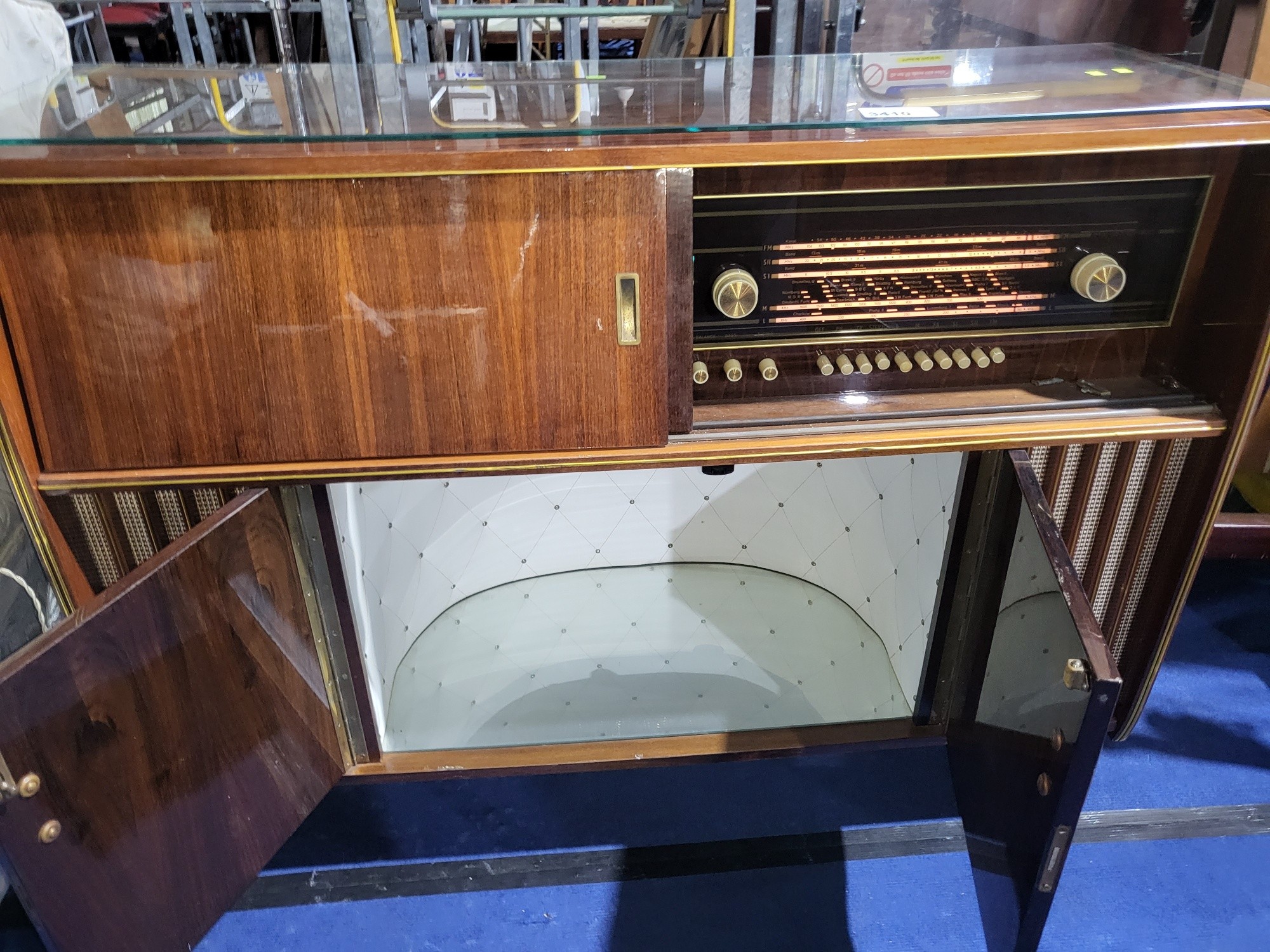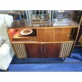 A 1960s vintage wooden cased radiogram/cocktail cabinet with sliding doors enclosing record playing deck and radio and two doors under enclosing a mirrored padded interior. Lights up when plugged in, hums, but unable to tune. Record deck does not revolve. Requires some attention.