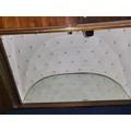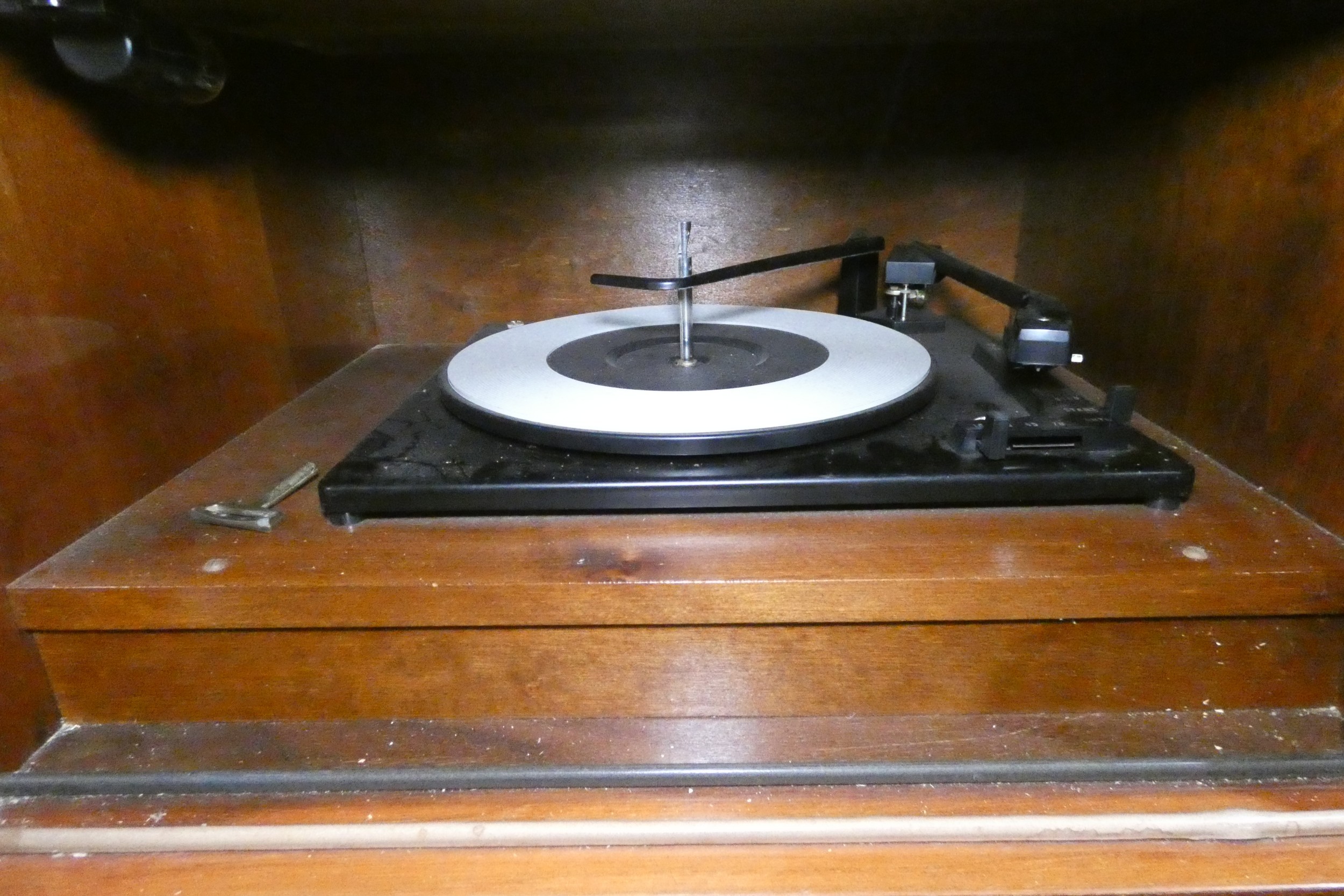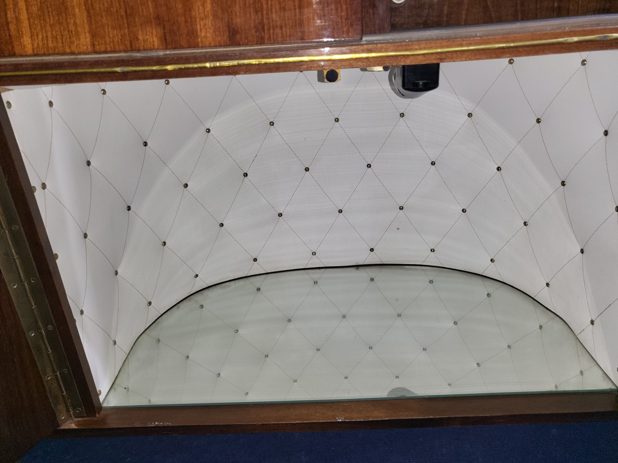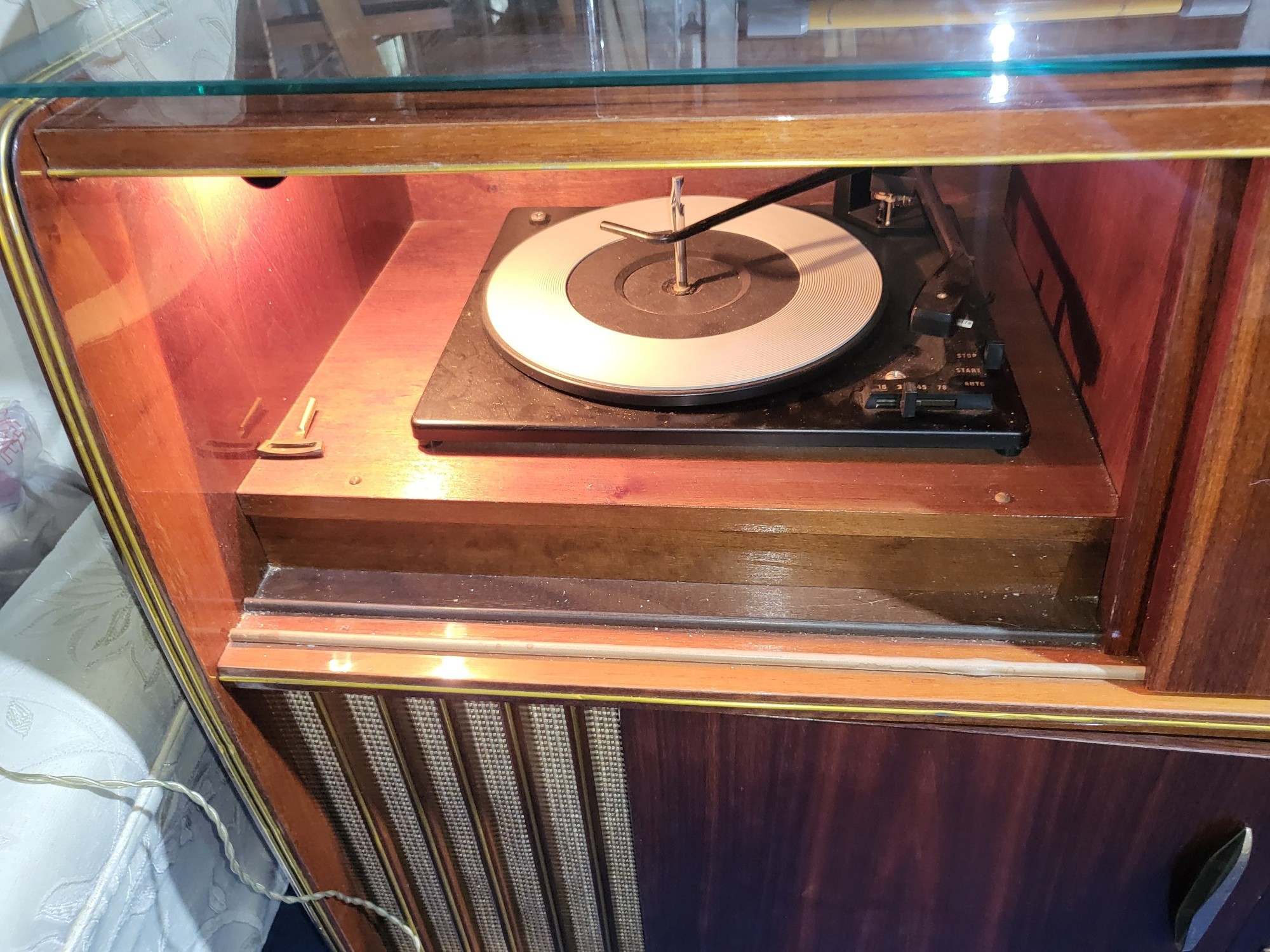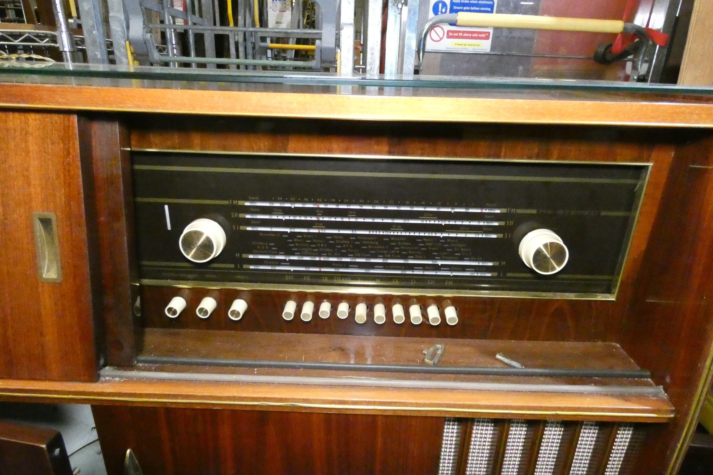 A 1960s vintage wooden cased radiogram/cocktail cabinet with sliding doors enclosing record playing deck and radio and two doors under enclosing a mirrored padded interior. Lights up when plugged in, hums, but unable to tune. Record deck does not revolve. Requires some attention.