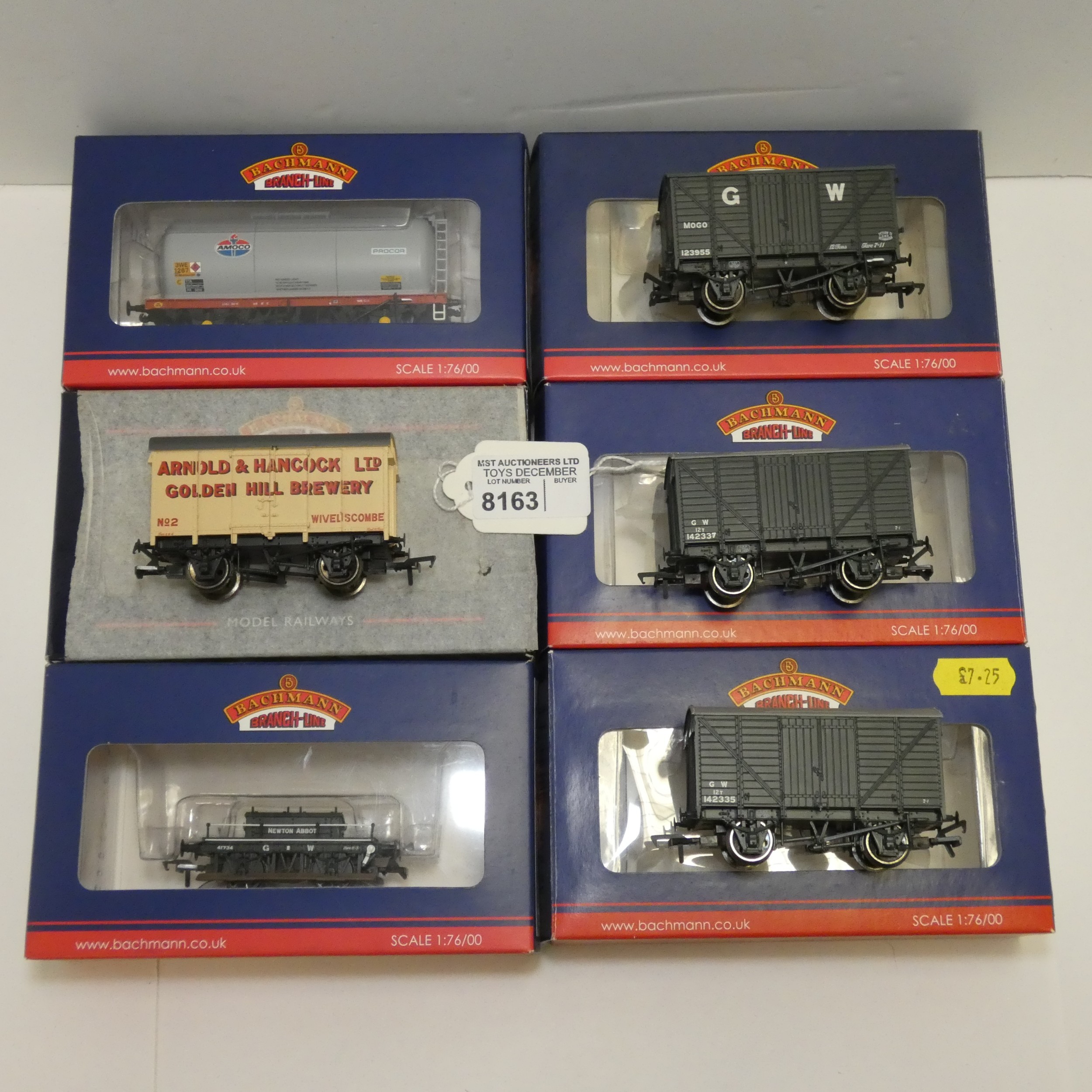 6 x various 00 gauge wagons by Bachmann to include 2 x 12 Ton Venrilated Van (37-730A), 1 x TTA Tank Wagon 'Amco' (37-585), 1 x Ventilated van 'Arnold & Hancock (38-075Y), 1 x 12 Ton Mogo Van (37-778B) and 1 x Shunter Truck (38-676)